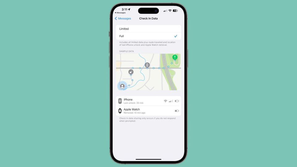 แอป Messages ได้รับการปรับปรุงหน้าจอแสดงตัวอย่างการ Check In เพื่อให้ผู้ใช้งานมองเห็นความแตกต่างระหว่างการแชร์ข้อมูลที่จำกัด กับการแชร์ข้อมูลแบบเต็ม ขณะที่หน้าจอการตั้งค่า ยังแสดงการชาร์จแบตเตอรี่และข้อมูลการปลดล็อก iPhone ที่ส่งไปพร้อมกับตำแหน่ง พร้อมเน้นข้อความให้ผู้ใช้งานทราบว่า ข้อมูลจะถูกแชร์เฉพาะเมื่อการ Check In ไม่ได้รับการตอบกลับเมื่อได้รับแจ้ง