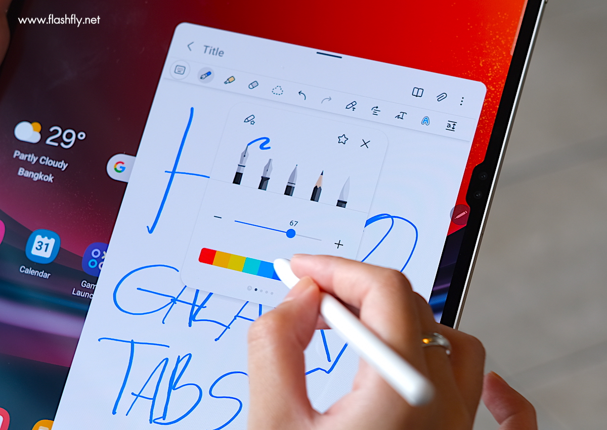 ครั้งแรกกับแท็บเล็ตของ Samsung ที่ได้รับการออกแบบมาให้ป้องกันน้ำและฝุ่นในระดับ IP68 ขณะที่ตัวเครื่องใช้วัสดุ Armor Aluminum ดีไซน์บางเบา แต่แข็งแรงทนทาน รองรับการใช้งานได้ทั้งในร่มและกลางแจ้ง ด้วยเทคโนโลยี Vision Booster ทำให้หน้าจอสู้แสงแดดได้อย่างดี โดยมีขนาดหน้าจอใหญ่ถึง 14.6 นิ้ว สำหรับ Galaxy Tab S9 Ultra ที่ทีมงาน @Flashfly ได้รับมารีวิว ให้ประสบการณ์การรับชมที่เต็มตา ไม่ว่าจะดูหนัง เล่นเกม และยังตอบสนองการทำงานได้อย่างยอดเยี่ยม โดยแถมปากกา S Pen มาให้ในกล่อง