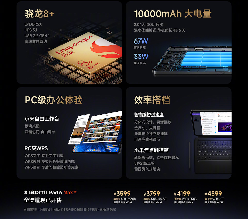 Xiaomi Pad 6 Max 14 มีให้เลือก 4 รุ่น ได้แก่ RAM 8GB + ROM 256GB / RAM 12GB + ROM 256GB / RAM 12GB + ROM 512GB / RAM 16GB + ROM 1TB ราคาเริ่มต้น 3,599 หยวน หรือราว 17,590 บาท ปากกา Stylus และแผงคีย์บอร์ด วางจำหน่ายแยกต่างหาก