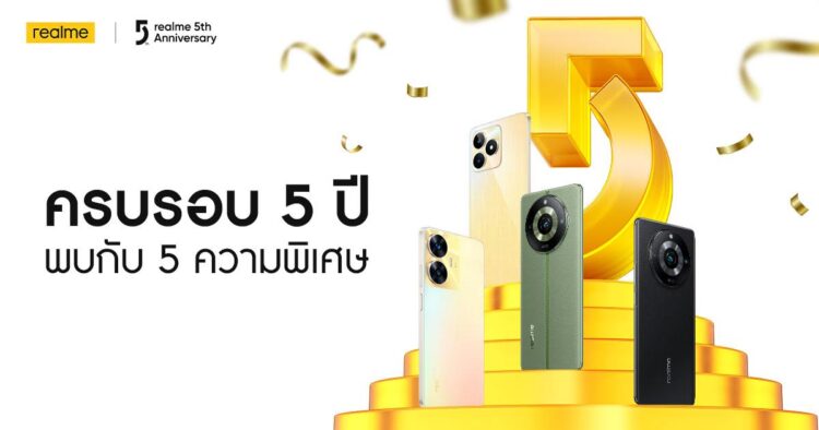 แฟนเรียลมีพร้อมหรือยัง? กับแคมเปญเฉลิมฉลองครั้งยิ่งใหญ่ “realme 5th Anniversary” ฉลองก้าวสู่ปีที่ 5 แห่งความสำเร็จภายใต้คอนเซ็ปต์ “LEAP UP” โดยตลอดระยะเวลา 5 ปีที่ผ่านมา realme สามารถที่จะก้าวกระโดดด้วยความกล้าที่จะแตกต่างได้อย่างสมบูรณ์ จึงทำให้ realme เป็นแบรนด์สมาร์ทโฟนที่เติบโตเร็วที่สุดในโลก โดยมียอดขายถึง 100 ล้านเครื่องทั่วโลก และล่าสุดเรียลมีได้ก้าวขึ้นสู่ Top 4 แบรนด์สมาร์ตโฟนในประเทศไทย ในไตรมาสที่ 2 ของปี 2566 ตอกย้ำความเป็นแบรนด์นวัตกรรมและความก้าวหน้าทางเทคโนโลยีอย่างแท้จริง ทั้งนี้ เรียลมีพร้อมจัดกิจกรรมร่วมสนุกและเตรียมมอบ 5 ของขวัญสุดพิเศษเพื่อเป็นการขอบคุณแฟน ๆในทุกช่องทาง ไม่ว่าจะเป็นตาม Brand Shop ศูนย์จำหน่ายชั้นนำ พร้อมเตรียมมอบ 5 ของขวัญสุดพิเศษ และกิจกรรมออนไลน์ตลอดเดือนสิงหาคม โดยเฉพาะโปรโมชั่นเซลล์สุดปังที่ทุกคนห้ามพลาด (ข้อมูลเพิ่มเติม : https://www.facebook.com/realmeTH/posts/pfbid02SH29mCsD9Uw3gUssxuqJQcDgQNLcMAQEvT1yjLorjAWDXAoAjQMrXjNFTyzahT3Ml)