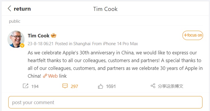 Tim Cook ซีอีโอของ Apple โพสต์ข้อความลงใน Weibo เว็บไซต์ไมโครบล็อกยอดนิยมในจีน เพื่อแสดงความขอบคุณต่อทีมงาน ลูกค้า และพาร์ทเนอร์ทั้งหมดในจีน ในโอกาสครบรอบ 30 ปี นับตั้งแต่ Apple บุกตลาดในแดนมังกร