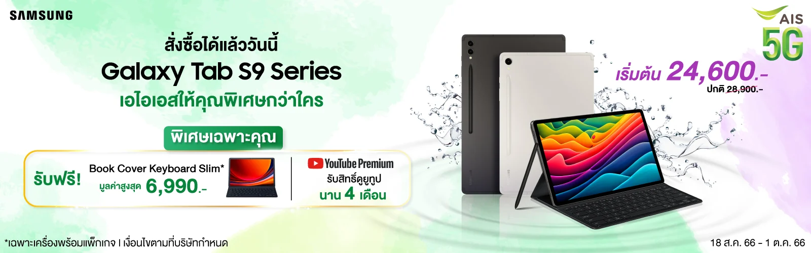 เฉพาะที่ AIS Online Store และชาว Flashfly รับโค้ดส่วนลดพิเศษ 300 บาท เพียงใส่โค้ด “FLASHFLY300” เมื่อซื้อ Samsung Galaxy Tab S9 Series ทุกรุ่น ตั้งแต่วันที่ 18 ก.ย. 66 – 1 ต.ค. 66 เท่านั้น (สิทธิ์มีจำนวนจำกัด)