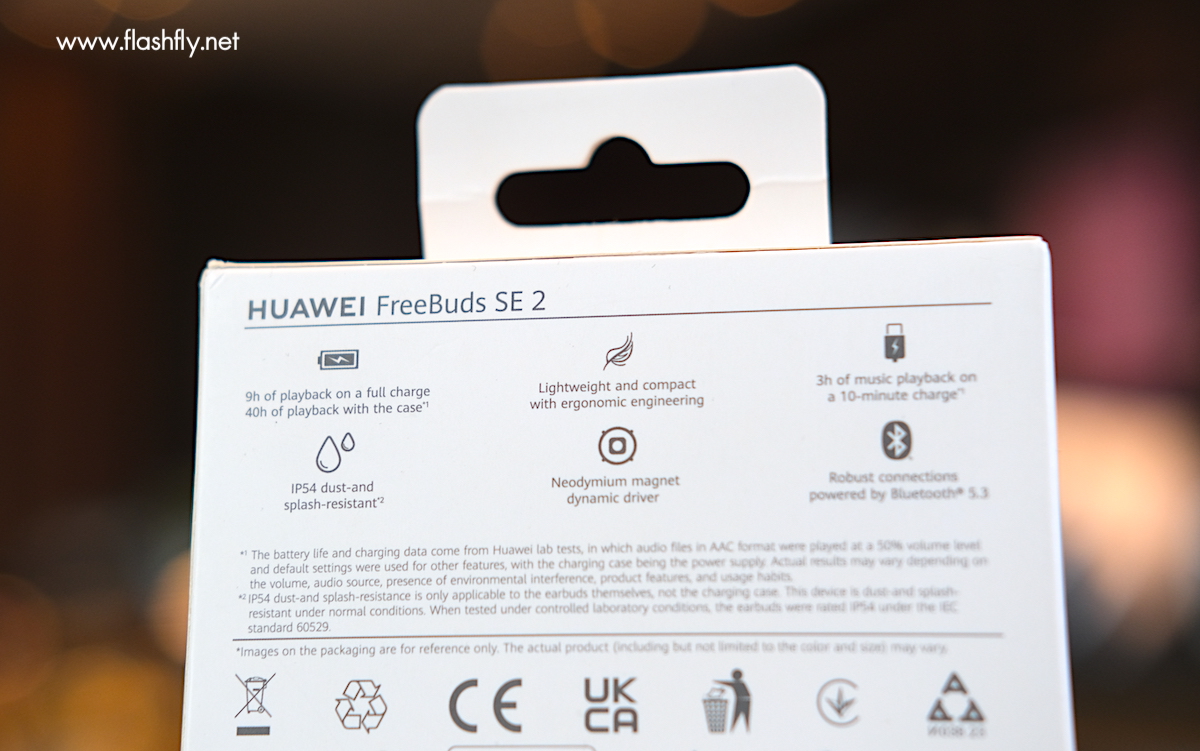 หลังกล่องให้รายละเอียดต่างๆ เกี่ยวกับหูฟัง พร้อมบอกจุดเด่นไว้ 6 รายการ ได้แก่ อายุการใช้งานแบตเตอรี่ นานสูงสุด 40 ชั่วโมง เมื่อใช้ร่วมกับเคสชาร์จ (เฉพาะหูฟังให้อายุการใช้งานนานสูงสุด 9 ชั่วโมง), ได้รับมาตรฐานป้องกันน้ำและกันฝุ่น IP54 (เฉพาะหูฟัง), น้ำหนักเบา ขนาดกะทัดรัด ดีไซน์ตามหลักสรีรศาสตร์, ไดรเวอร์แบบไดนามิก ใช้วัสดุแม่เหล็กนีโอไดเมียม, รองรับชาร์จเร็ว ชาร์จเพียง 10 นาที ฟังเพลงได้นาน 3 ชั่วโมง และ รองรับการเชื่อมต่อ Bluetooth 5.3