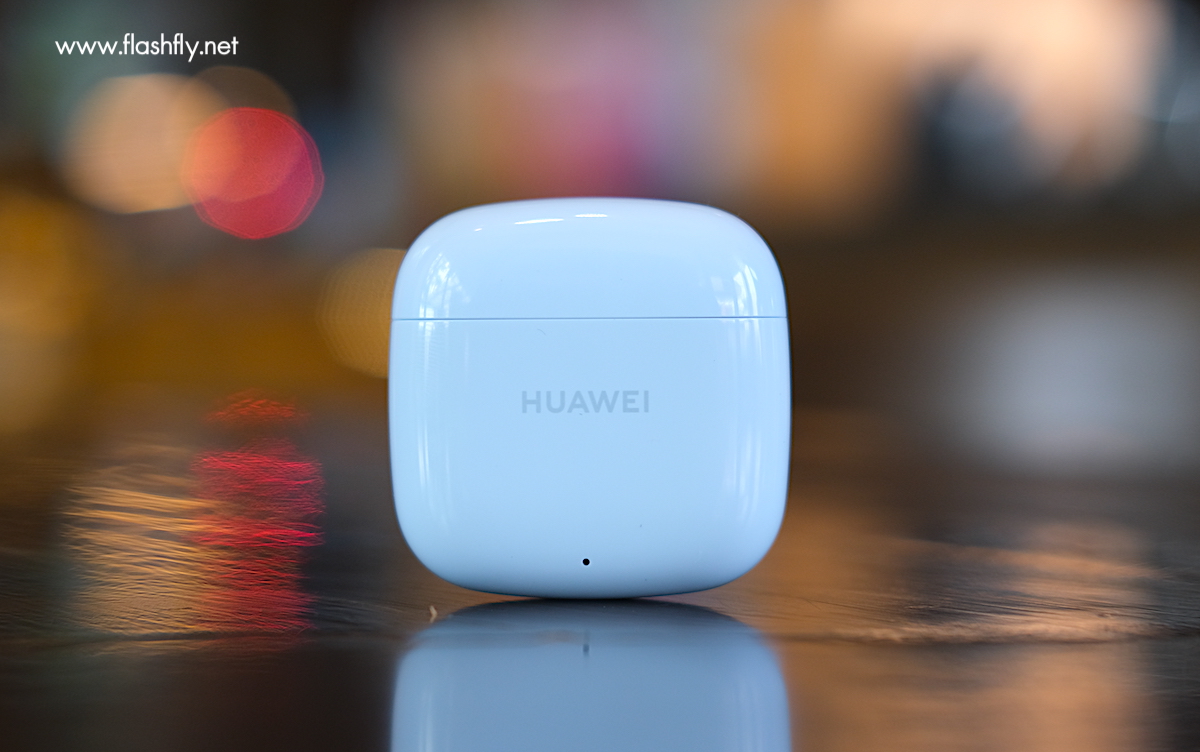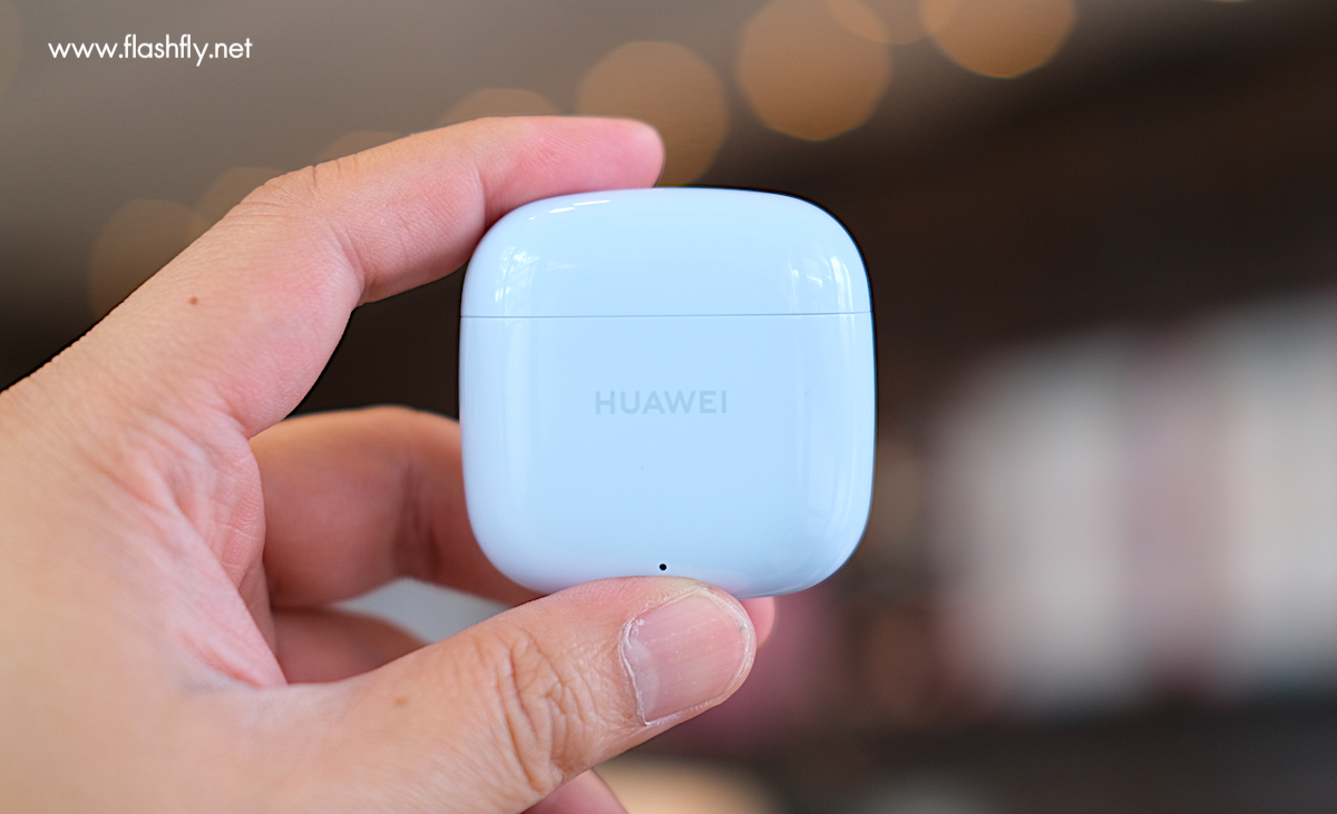 สำหรับเคสชาร์จ ใช้สีเดียวกับหูฟัง ชั่งน้ำหนักได้ 33 กรัม ด้านหน้ามีโลโก้ HUAWEI ถัดลงมาจะพบไฟ LED 1 จุด ด้านล่างเป็นตำแหน่งพอร์ตชาร์จ USB-C และแน่นอนว่าด้านบนเป็นฝาปิด ซึ่งสามารถจับคู่กับสมาร์ทโฟนได้ทันทีที่เปิดฝา