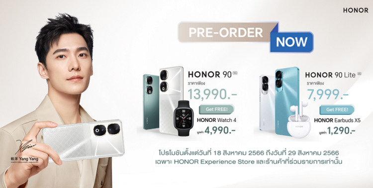 ร่วมสัมผัสปรากฏการณ์สมาร์ทโฟนที่สุดแห่งความคุ้มค่าอย่าง HONOR 90 Series โดย HONOR 90 5G มาพร้อมใน 3 เฉดสี ได้แก่ สีเขียว Emerald Green สีเงิน Diamond Silver สีฟ้า Peacock Blue และ HONOR 90 Lite 5G มาด้วยกันใน 2 เฉดสี ได้แก่ สีฟ้า Cyan Lake และสีดำ Midnight Black ที่สาวก HONOR ประเทศไทยห้ามพลาด พร้อมพรีออเดอร์ได้ตั้งแต่วันที่ 18 สิงหาคม – 29 สิงหาคม ที่ร้านค้าตัวแทนจำหน่ายทั่วประเทศ และช่องทางออนไลน์บนแพลตฟอร์ม Lazada พร้อมรับสิทธิพิเศษเฉพาะลูกค้าที่พรีออเดอร์ HONOR 90 5G รับฟรีทันที HONOR Watch 4 มูลค่า 4,990 บาท และสำหรับลูกค้าที่พรีออเดอร์ HONOR 90 Lite 5G รับฟรีทันที HONOR Earbuds X5 มูลค่า 1,290 บาท ทั้งนี้ HONOR 90 Series จะวางจำหน่ายอย่างเป็นทางการในวันที่ 2 กันยายน 2566 เป็นต้นไปที่ช่องทางออนไลน์ และ HONOR Official Store รวมถึงร้านค้าตัวแทนจำหน่าย HONOR ที่ร่วมรายการทั่วประเทศ และ HONOR Experience Store ที่ศูนย์การค้าเซ็นทรัล พระราม 2 และศูนย์การค้าเอ็มบีเค เซ็นเตอร์ สามารถติดตามรายละเอียดและสอบถามข้อมูลเพิ่มเติมได้ที่ Facebook: HONOR Thailand, Instagram: HONOR Thailand