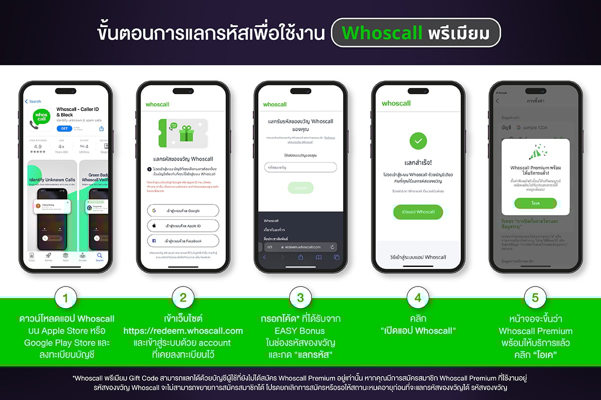 จากนั้นนำรหัสที่ได้ไปแลกที่ https://redeem.whoscall.com โดยลงทะเบียนเข้าสู่ระบบด้วยบัญชีเดียวกับที่ใช้งานในแอป Whoscall ทั้งนี้ แอปพลิเคชัน Whoscall พัฒนาโดย Gogolook ผู้ให้บริการเทคโนโลยีเพื่อความเชื่อมั่น (Trust-Tech) ในการสร้างเครือข่ายและระบบการต่อต้านการฉ้อโกงของโลก สามารถดาวน์โหลดได้ฟรี!! ผ่านทาง App Store และ Play Store