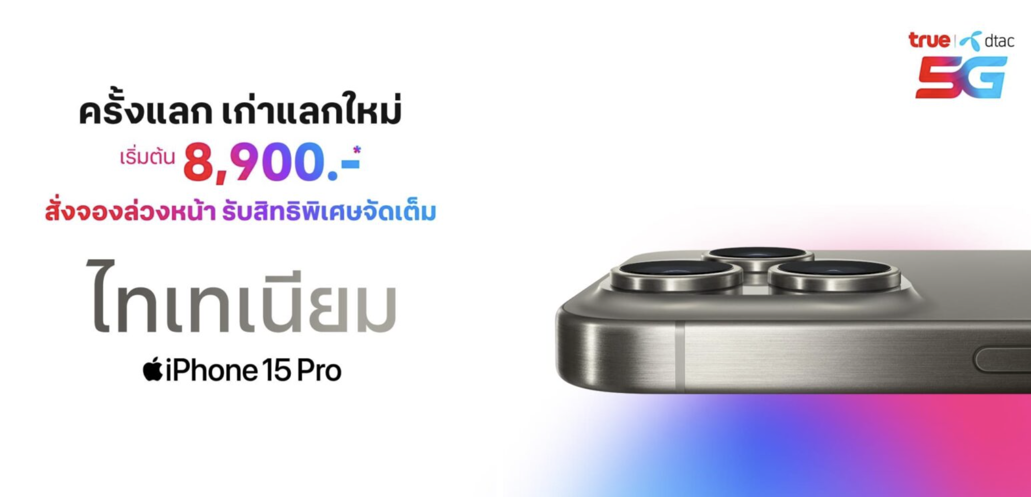 TrueMove H และ Dtac นำเสนอโปรโมชันเก่าแลกใหม่ iPhone 15 เริ่มต้น 0 บาท iPhone 15 Pro เก่าแลกใหม่ เริ่มต้น 8,900 บาท พร้อมแพ็กเกจรายเดือน 5G BETTER+ บนเครือข่าย 5G อัจฉริยะ รับสิทธิพิเศษจัดเต็มกว่าใคร รับเครื่องเป็นกลุ่มแรกของโลก เมื่อสั่งจองล่วงหน้าทางออนไลน์ ระหว่างวันที่ 15 – 21 กันยายน 2566