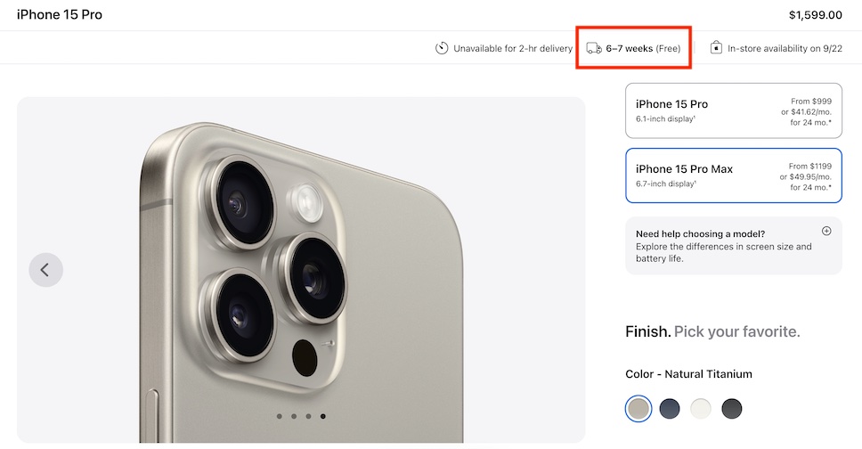หลังจาก Apple เปิดให้ทำรายการสั่งซื้อล่วงหน้าสำหรับ iPhone 15 Series ได้ไม่นาน ระยะเวลาในการจัดส่ง iPhone 15 Pro Max ก็ถูกประเมินไว้ที่ประมาณ 6 – 7 สัปดาห์ ขณะที่ iPhone 15 Pro มีระยะเวลาการจัดส่งประมาณ 2 – 3 สัปดาห์