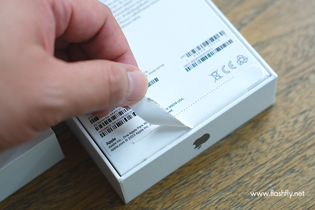 หลังกล่องระบุชื่อผลิตภัณฑ์ และบอกรายละเอียดอุปกรณ์ภายในกล่อง โดยมีแถบสติกเกอร์ติดอยู่ที่ขอบกล่อง เป็นการปิดผนึกแทนการซีลด้วยแผ่นพลาสติก ซึ่ง Apple เปลี่ยนวิธีการซีลตั้งแต่ iPhone 13 ที่ออกมาในปี 2021