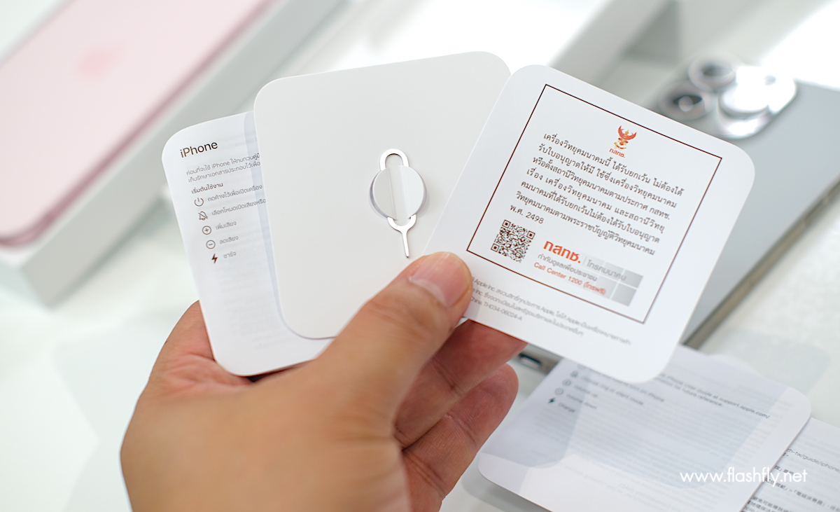หลังจากหยิบ iPhone ขึ้นมาจากกล่อง จะพบกับซองเอกสาร ซึ่งภายในยังแถมสติกเกอร์โลโก้ Apple มาให้เหมือนเคย พร้อมด้วยเข็มช่วยถอดถาดใส่ซิมการ์ด ส่วนเอกสารต่างๆ ประกอบด้วย คู่มือแนะนำการใช้งานเบื้องต้น การรับประกัน และ เอกสารยืนยันว่าผ่านการรับรองจาก กสทช.