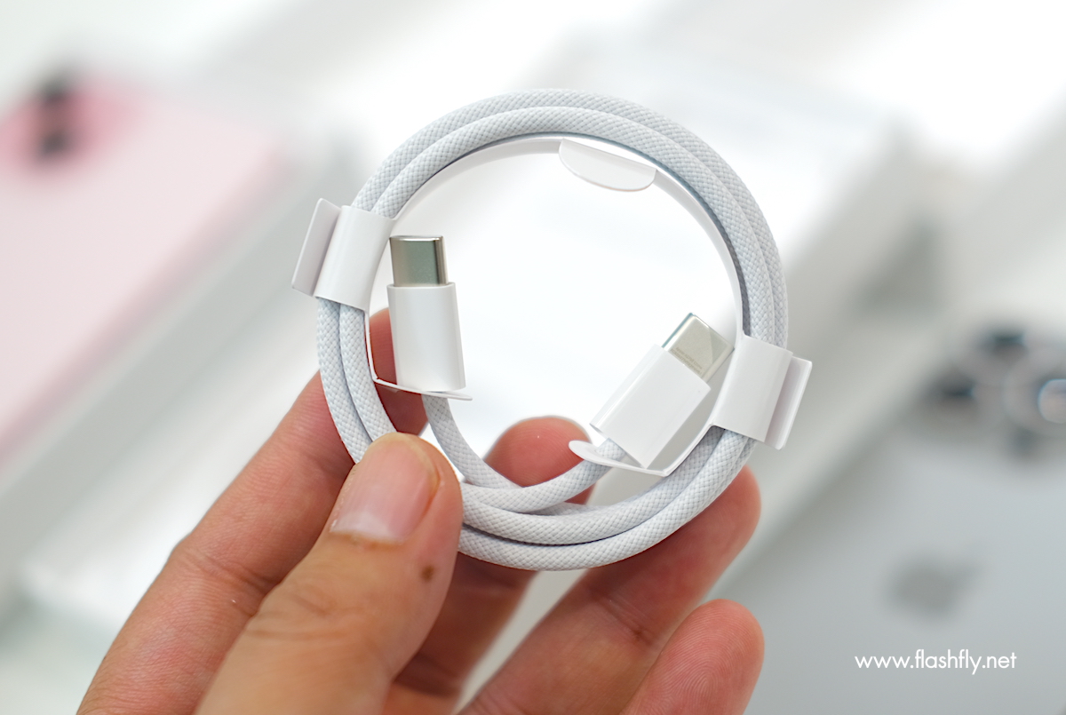 ของแถมอย่างเดียวภายในกล่อง มีเพียงสายชาร์จ แต่ไม่เหมือนกับปีที่แล้ว เพราะ iPhone 15 Series ทุกรุ่นได้รับสายชาร์จแบบใหม่ เป็นสายถักที่มีความทนทานกว่าเดิม ส่วนขั้วต่อของปลายสายทั้ง 2 ด้าน เป็น USB-C อย่างที่หลายคนคงทราบกันแล้วว่า iPhone 15 รุ่นใหม่ในปีนี้ เปลี่ยนมาใช้พอร์ต USB-C แทนที่ Lightning