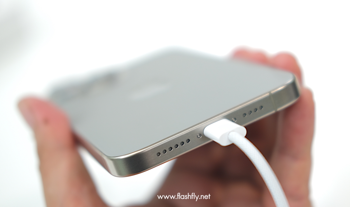 iPhone 15 Series ทุกรุ่น เปลี่ยนมาใช้พอร์ต USB-C มาตรฐานการชาร์จและการถ่ายโอนข้อมูลที่ใช้ในอุปกรณ์ส่วนใหญ่ จึงสามารถใช้สายเส้นเดียวกันเพื่อชาร์จได้ทั้ง iPhone, Mac, iPad รวมถึง AirPods Pro (รุ่นที่ 2) ที่มาพร้อมเคสชาร์จ USB-C