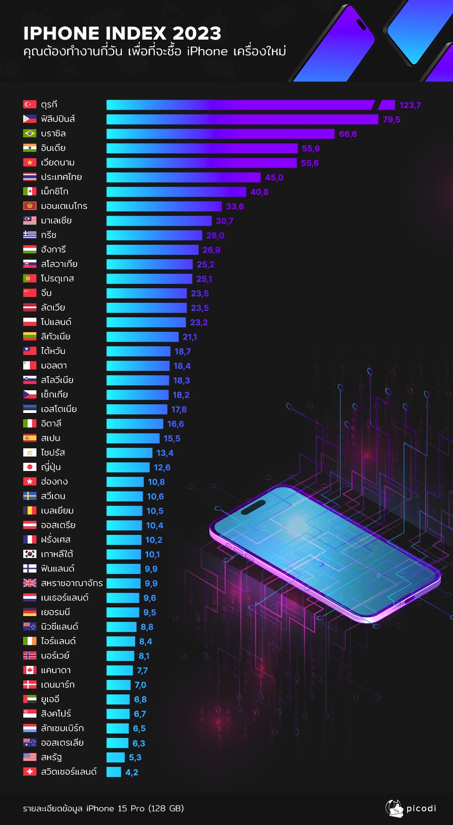 ผลสำรวจจาก Picodi พบว่าคนไทยต้องทำงาน 45 วัน จึงสามารถซื้อ iPhone 15 Pro ได้ เมื่อเทียบกับประเทศใกล้เคียง มาเลเซียใช้เวลาทำงาน 30.7 วัน, เวียดนาม 55.6 วัน และ ฟิลิปปินส์ ต้องทำงานถึง 79.5 วัน แต่ยังไม่แย่ที่สุด เพราะชาวตุรเกียต้องทำงานมากถึง 123.7 วัน จึงจะสามารถซื้อ iPhone 15 Pro ได้