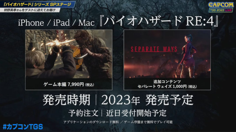 สำหรับเกม Resident Evil 4 Remake จะเริ่มวางจำหน่ายบน iPhone, iPad และ Mac ภายในปีนี้ ราคา 7,990 เยน หรือราว 1,990 บาท และวางจำหน่าย DLC Separate Ways แยกต่างหากในราคา 1,000 เยน หรือราว 290 บาท แต่ยังไม่ทราบกำหนดการวางจำหน่ายที่แน่นอน