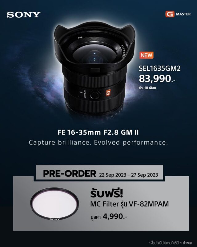 ·             เลนส์ G Master FE 16-35mm. F2.8 GM II จะเปิดให้ผู้สนใจสั่งจองล่วงหน้าเช่นกนั ตั้งแต่วันที่ 22 ถึง 27 กันยายน ศกนี้ ในราคา 83,990 บาท โดยผู้สั่งจองในช่วงเวลาดังกล่าว จะได้รับ MC Filter รุ่น VF-82MPAM จำนวน 1 ชิ้น มูลค่า 4,990 บาท ทั้งนี้ เลนส์ G Master FE 16-35 mm. F2.8 GM II จะเริ่มวางจำหน่ายอย่างเป็นทางการ ตั้งแต่เดือนตุลาคม 2566 เป็นต้นไป