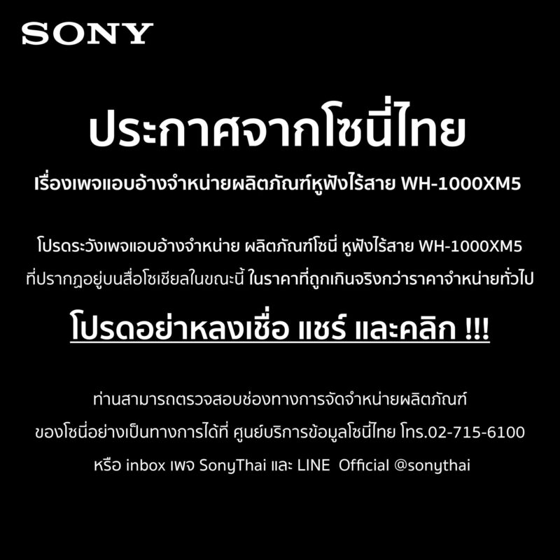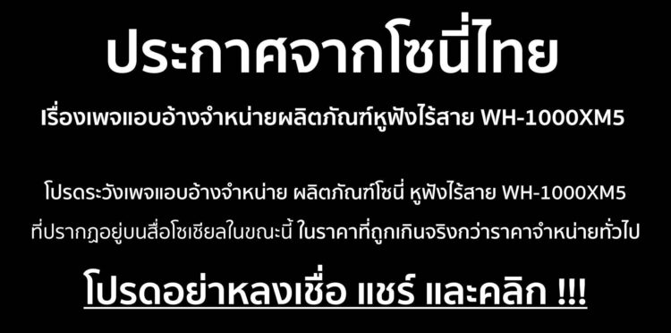 บริษัท โซนี่ ไทย จำกัด ขอแจ้งให้ทราบว่า ขณะนี้ได้มีกลุ่มมิจฉาชีพกระทำการหลอกลวงโดยสร้างเพจปลอมแอบอ้างจำหน่ายและโฆษณาสินค้าโซนี่ รวมถึงการสร้างเพจปลอมอ้างเป็นลูกค้าที่ได้ซื้อสินค้าโซนี่ในราคาถูก หรือกระทำการอื่นใดเพื่อจูงใจให้ผู้หลงเชื่อกดลิงค์ที่สร้างขึ้นเพื่อให้เข้าไปติดตาม ให้ข้อมูล และซื้อสินค้าราคาถูกหรือได้ข้อเสนอพิเศษดังกล่าว ซึ่งบริษัท ฯ ไม่ได้มีส่วนเกี่ยวข้อง อนุญาต หรือรู้เห็นยินยอมด้วยแต่อย่างใด ดังนั้น บริษัท ฯ ขอแจ้งเตือนประชาชนว่า อย่าหลงเชื่อ กดลิงก์ เผยแพร่ ส่งต่อ หรือให้ข้อมูลใด ๆ อย่างเด็ดขาด และกรุณาตรวจสอบข้อมูลก่อนตัดสินใจทุกครั้ง