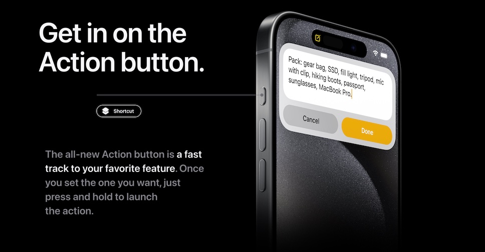 iPhone 15 Pro และ iPhone 15 Pro Max นำปุ่ม Action มาใช้งานแทนที่ปุ่มปิดเสียงแบบสวิตช์ ซึ่งสามารถตั้งค่าให้กดเพื่อเปิดฟีเจอร์ได้ตามต้องการ จากทั้งหมด 9 ฟังก์ชัน ได้แก่ Silent Mode, Focus, Camera, Flashlight, Voice Memo, Translate, Magnifier, Accessibility และ Shortcuts