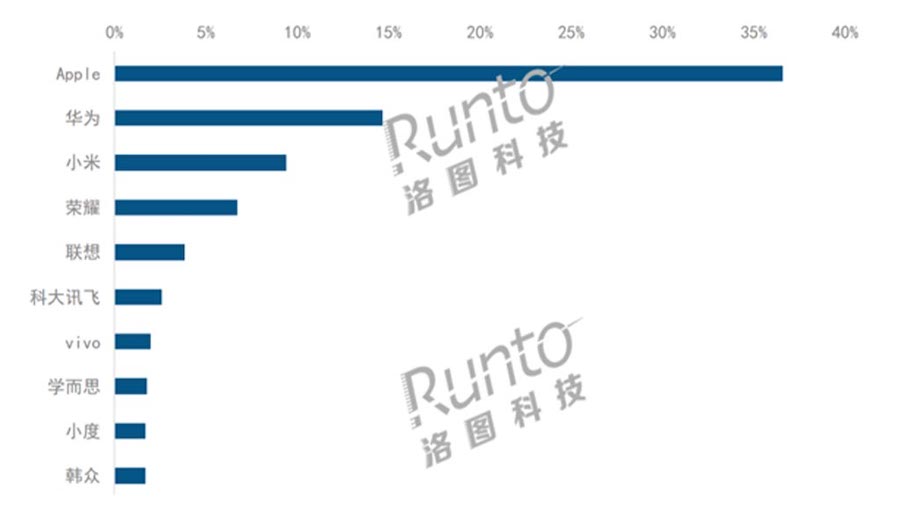 Runto ระบุว่า แบรนด์แท็บเล็ต ที่มียอดขายดีที่สุดใน 4 อันดับแรก เป็นของ Apple, Huawei, Xiaomi และ Honor ตามลำดับ โดยมียอดขายรวมกันถึง 67% ของยอดขายแท็บเล็ตทั้งหมดในตลาดจีน