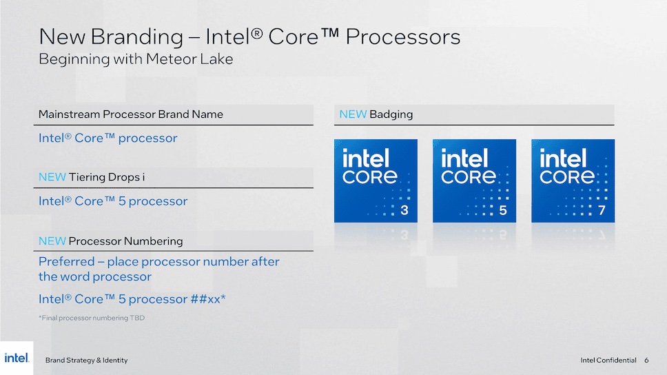 Intel ยืนยันโปรเซสเซอร์รุ่นที่ 14 หรือที่รู้จักในชื่อ Raptor Lake Refresh ถือเป็นจุดสิ้นสุดของรูปแบบการตั้งชื่อ Core i โดยโปรเซสเซอร์รุ่นถัดไป จะใช้รูปแบบการตั้งชื่อใหม่ ที่สั้นลงกว่าเดิม ตัดตัว i หรือแต่ Core