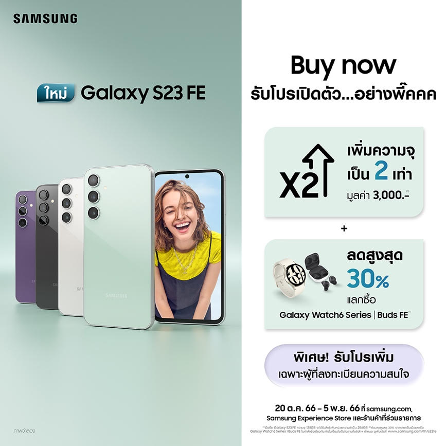 ตั้งแต่วันนี้ – 5 พฤศจิกายน 2566 ผ่านทาง samsung.com, Samsung Experience Store และร้านค้าที่ร่วมรายการ เป็นเจ้าของก่อนใคร คลิกเลย! https://smsng.store/Buy_S23FE