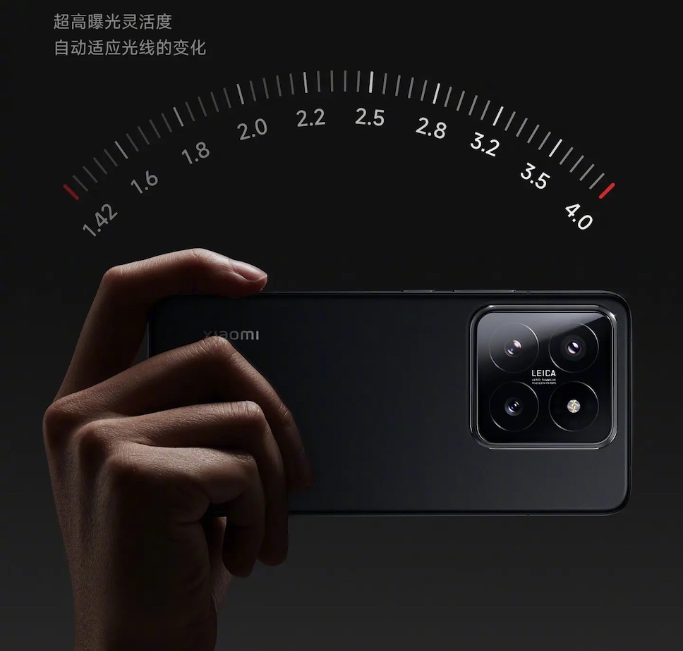 Xiaomi 14 Pro ชูจุดเด่นที่ระบบกล้อง 3 ตัว จาก Leica ประกอบด้วย กล้องหลัก 50 ล้านพิกเซล ขนาดเซ็นเซอร์ 1/1.31 นิ้ว ขนาดพิกเซล 1.2 ไมครอน มีรูรับแสงที่ปรับได้ตั้งแต่ f/1.42 ที่กว้างที่สุดไปจนถึง f/4.0 มีระบบกันสั่น OIS และใช้เลนส์ Leica Summilux แบบกำหนดเอง 23 มม. เรียกว่า Light Nunter 900, กล้อง Telephoto แบบ Floating เลนส์ 75 มม. ขนาดรูรับแสง f/2.0 มีระบบกันสั่น OIS สามารถถ่ายภาพระยะใกล้ได้ 10 ซม. โดยจะถ่ายภาพปกติ 40 ล้านพิกเซล และภาพพอร์ตเทรต 50 ล้านพิกเซล และกล้อง Ultra Wide ความละเอียด 50 ล้านพิกเซล เลนส์ 14 มม. ขนาดรูรับแสง f/2.2 ให้มุมมองภาพ 115 องศา และรองรับการถ่ายภาพในโหมดมาโคร ระยะ 5 ซม.