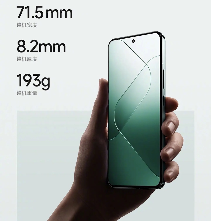 Xiaomi 14 มาพร้อมจอแสดงผล LTPO OLED ความละเอียด 1200 x 2670 พิกเซล ขนาด 6.36 นิ้ว รองรับอัตราการรีเฟรช 120Hz และให้ความสว่างสูงสุด 3,000 นิต โดยมีความยาว 152.8 มม. กว้าง 71.5 มม. บาง 8.20 มม. น้ำหนัก 193 กรัม สำหรับรุ่นที่ใช้วัสดุกระจก และ 188 กรัม สำหรับรุ่นที่ใช้ฝาหลังแบบหนัง