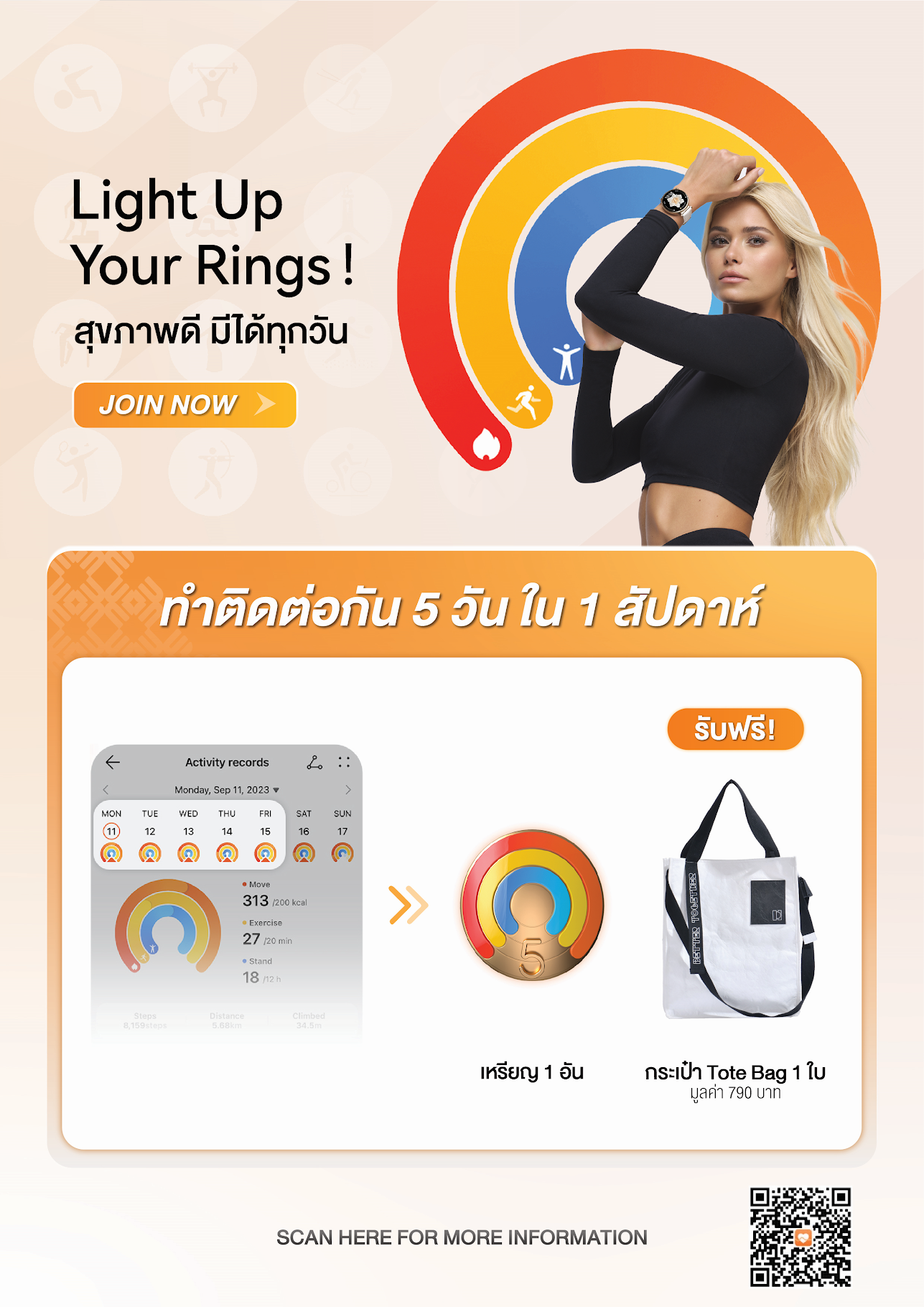 พบกับกิจกรรม Light Up Your Rings ชวนผู้ใช้งาน HUAWEI WATCH GT 4 Series หรือสมาร์ทวอทช์หัวเว่ยรุ่นใดก็ได้ สร้างไลฟ์สไตล์ที่ดีต่อสุขภาพจัดขึ้นในวันที่ 25 ตุลาคม 2566 ถึง วันที่ 12 พฤศจิกายน 2566 เท่านั้น ณ ร้าน Huawei Experience Store สาขาที่ร่วมกิจกรรมเท่านั้น โดยผู้ใช้งานสมาร์ทวอทช์หัวเว่ยรุ่นใดก็ได้สามารถเข้าร่วมกิจกรรมเพียงเปิดใช้งานโหมดออกกำลังกายที่แอป HUAWEI Health เป็นเวลา 20 นาทีต่อวันได้แก่ ลุกยืน เดิน วิ่ง กระโดด ออกกำลังกาย และนับแคลอรี 150 แคลอรี ต่อ วัน โดยทำครบติดต่อกัน 5 วัน ใน 1 สัปดาห์ เมื่อทำครบเป้าหมายคุณจะได้รับเหรียญรางวัล Active Week และรับฟรี กระเป๋าผ้า Tote Bag 1 ใบ มูลค่า 790 บาท ที่ร้าน Huawei Experience Store สาขาที่ร่วมกิจกรรมเท่านั้น ศึกษารายละเอียดกิจกรรมเพิ่มเติมได้ที่นี่