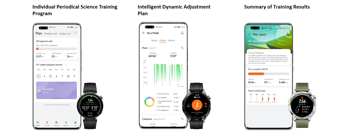 คำแนะนำด้านฟิตเนสอัจฉริยะระดับมืออาชีพ: คุณสามารถปรับแต่งแผนเทรนนิ่งทางวิทยาศาสตร์ตามเป้าหมายการฝึกอบรม[3] อัลกอริธึมแผนการวิ่งอัจฉริยะ นาฬิกาจะปรับตารางเส้นทางสำหรับสัปดาห์หน้าอย่างชาญฉลาดและให้ความสนใจกับสถานะของนักวิ่งตลอดเวลา ด้วยแอป HUAWEI Health คุณสามารถดู