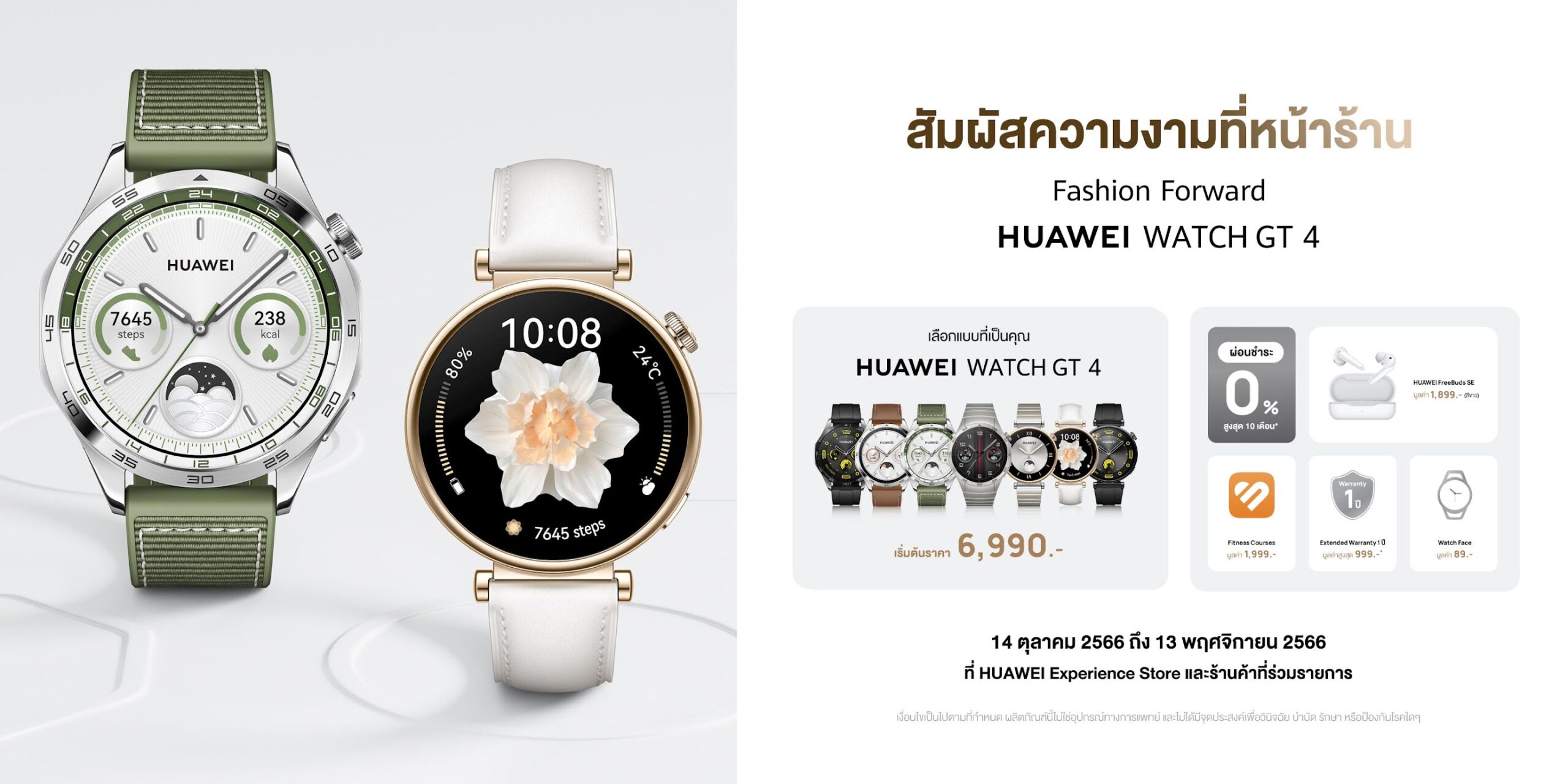 HUAWEI WATCH GT 4 ขนาด 46 มม. มาพร้อม 4 สี ได้แก่ สีเทา สายสแตนเลส สีเขียว สีน้ำตาล และสีดำ ในราคาเริ่มต้นที่ 6,990 บาท HUAWEI WATCH GT 4 ขนาด 41 มม. มาพร้อม 3 สี ได้แก่ สีเทา สีขาว และสีดำ ในราคาเริ่มต้นที่ 6,990 บาท พร้อมโปรโมชันเมื่อซื้อตั้งแต่วันที่ 14ตุลาคม 2566 – 13พฤศจิกายน 2566 ที่ HUAWEI Experience Storeและร้านค้าที่ร่วมรายการ รับฟรีทันที หูฟัง HUAWEI FreeBuds SE มูลค่า 1,899บาท Fitness Course ในแอปHUAWEI Healthมูลค่า 1,999บาท ขยายระยะเวลาดูแลเครื่อง 1ปี มูลค่า 999บาท และ HUAWEI Watch Faceมูลค่า 89บาท