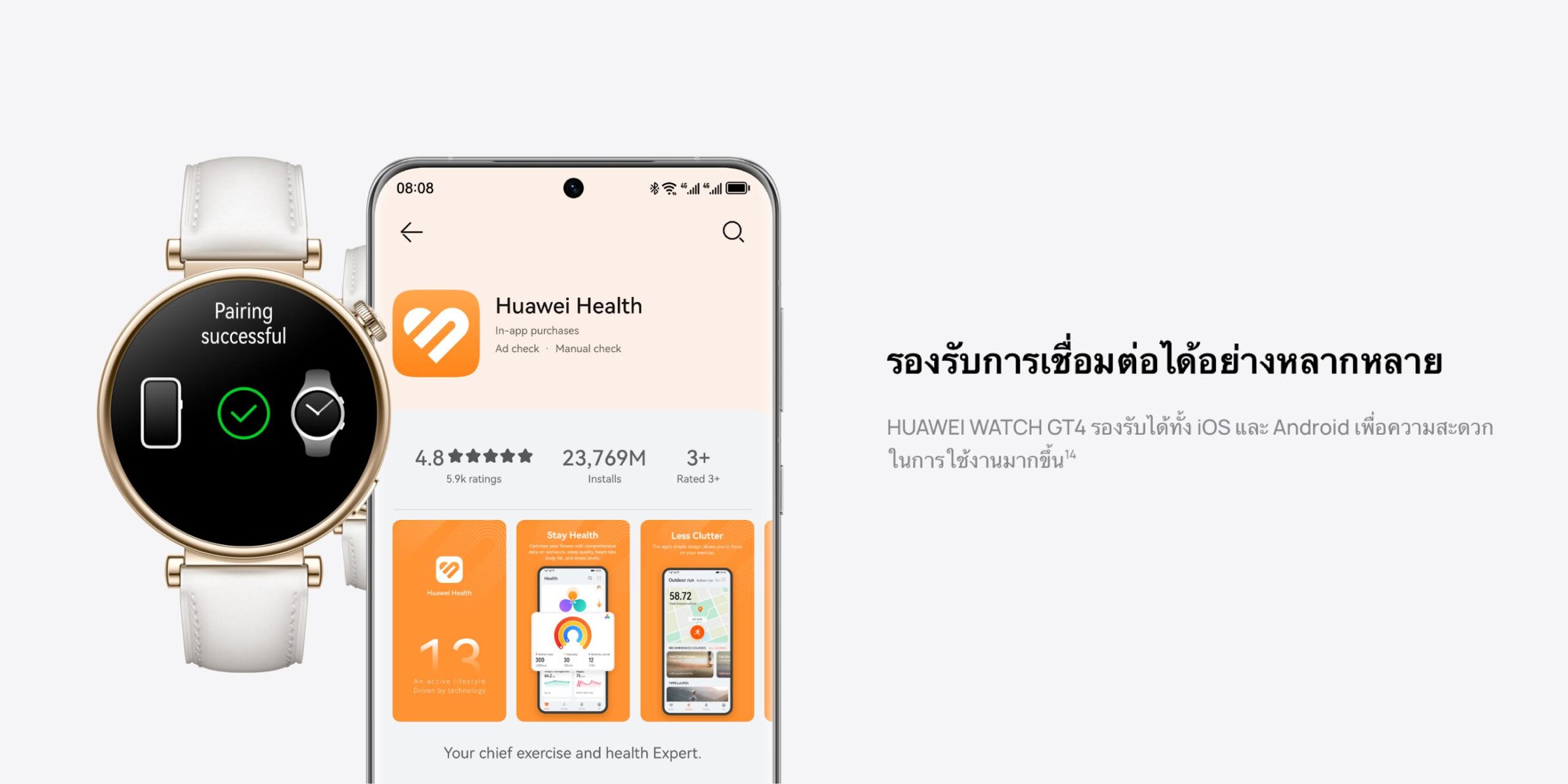 สมาร์ทวอทช์ส่วนใหญ่ในตลาดมักจะอนุญาตให้มีการจับคู่เชื่อมต่อภายในระบบปฏิบัติการสมาร์ทโฟนของตัวเองเท่านั้น แต่สำหรับ HUAWEI WATCH GT 4 Series นั้นรองรับการเชื่อมต่อแบบวงกว้างได้อย่างหลากหลายทั้งระบบปฏิบัติการ iOS และ Android เพื่อเพิ่มความสะดวกในการงานใช้งานสมาร์ทวอทช์หัวเว่ยมากยิ่งขึ้น[1]