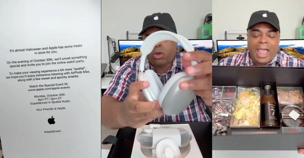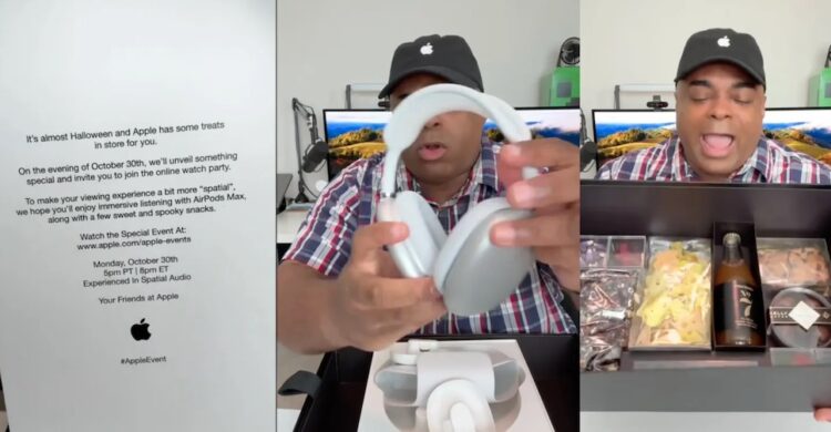 ภายในกล่องของขวัญที่ Apple ส่งให้กับอินฟลูเอนเซอร์ มาพร้อม AirPods Max หูฟังแบบครอบหูระดับไฮเอนด์ของ Apple พร้อมข้อความว่า “เพื่อให้ประสบการณ์การรับชมของคุณมี มิติ มากขึ้น เราหวังว่าคุณจะเพลิดเพลินกับการฟังที่ดื่มด่ำด้วย AirPods Max พร้อมด้วยของว่างแสนหวานและน่าขนลุก”