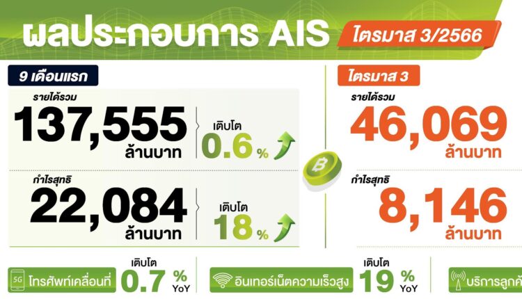 AIS รายงานผลประกอบการ 9 เดือนแรกปี 2566 ทำรายได้ 137,555 ล้านบาท มีกำไร 22,084 ล้านบาท เติบโตขึ้น 18%