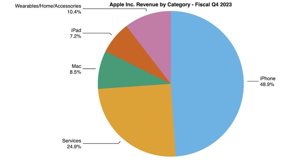 สำหรับปีงบประมาณเต็ม Apple มียอดขาย 3.833 แสนล้านดอลลาร์สหรัฐ และกำไรสุทธิ 9.7 หมื่นล้านดอลลาร์สหรัฐ ลดลงเล็กน้อยจากยอดขาย 3.943 แสนล้านดอลลาร์สหรัฐ และกำไรสุทธิ 9.98 หมื่นล้านดอลลาร์สหรัฐ ในปีงบประมาณ 2022