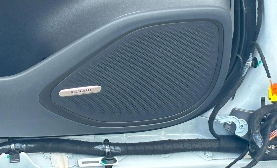 น่าเสียดายที่ EV ของ Xiaomi ถูกอำพรางด้วยสติกเกอร์รอบคัน แต่ก็เผยให้เห็นดีไซน์โดยรวม และแผงประตูด้านใน ซึ่งมีโลโก้ Xiaomi ติดอยู่ที่ลำโพง
