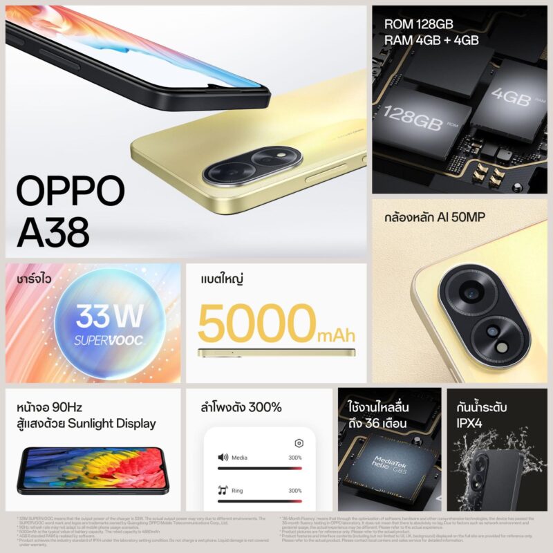 และ OPPO A38 สมาร์ตโฟนพร้อมมอบประสบการณ์การใช้งานคุ้มค่า ตอบโจทย์ทุกเอนเตอร์เทนเมนต์ ด้วยการมาพร้อมหน่วยความจำจุใจ ROM 128GB และ RAM 4GB เพิ่มได้อีก 4GB ใช้งานได้ลื่นไหลไม่มีสะดุด พร้อมใช้งานตลอดวันด้วยชาร์จไว 33W SUPERVOOC และแบตเตอรี่ขนาดใหญ่ 5,000mAh ถูกใจสายเอนเตอร์เทน ไม่ว่าจะดูหนังหรือเล่นเกมก็ดื่มด่ำได้เต็มอรรถรสด้วยหน้าจอลื่นไหล 90Hz สู้แสงด้วย Sunlight Display และโหมด Ultra Volume เพิ่มเสียงลำโพงดังขึ้นได้อีก 300% พร้อมถ่ายภาพสนุกทุกองศาด้วยกล้องหลัก AI 50MP