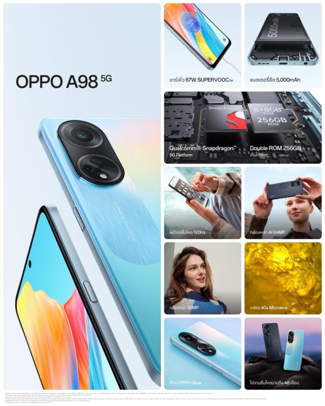 OPPO A98 5G สมาร์ตโฟนมาพร้อมชาร์จไว 67W SUPERVOOC อัปเกรดสเปคมาพร้อมดับเบิ้ล ROM 256GB และ ดับเบิ้ล RAM 8GB เพิ่มได้อีก 8GB ใช้งานลื่นไหลเป็นพิเศษ ตอบโจทย์ทุกไลฟ์สไตล์ความสนุกด้วยหน้าจออัปเกรดขนาดใหญ่ 6.72 นิ้วใช้งานไหลลื่นด้วย 120Hz refresh rate ฟีลจอยทุกโมเมนต์ นอกจากนี้ยังมาพร้อมกล้องหลัก AI ความละเอียด 64MP เก็บครบทุกโมเมนต์แบบไม่ช็อตฟีล พร้อมสำรวจมุมมองใหม่ๆ ในการถ่ายภาพด้วย 40x Microlens กล้องจุลทรรศน์ให้คุณสำรวจโลกใบจิ๋วที่แตกต่างไปจากเดิม โดดเด่นด้วยดีไซน์ 3D Micro-Curved ให้คุณจับถือสมาร์ตโฟนได้ง่ายกว่าที่เคย