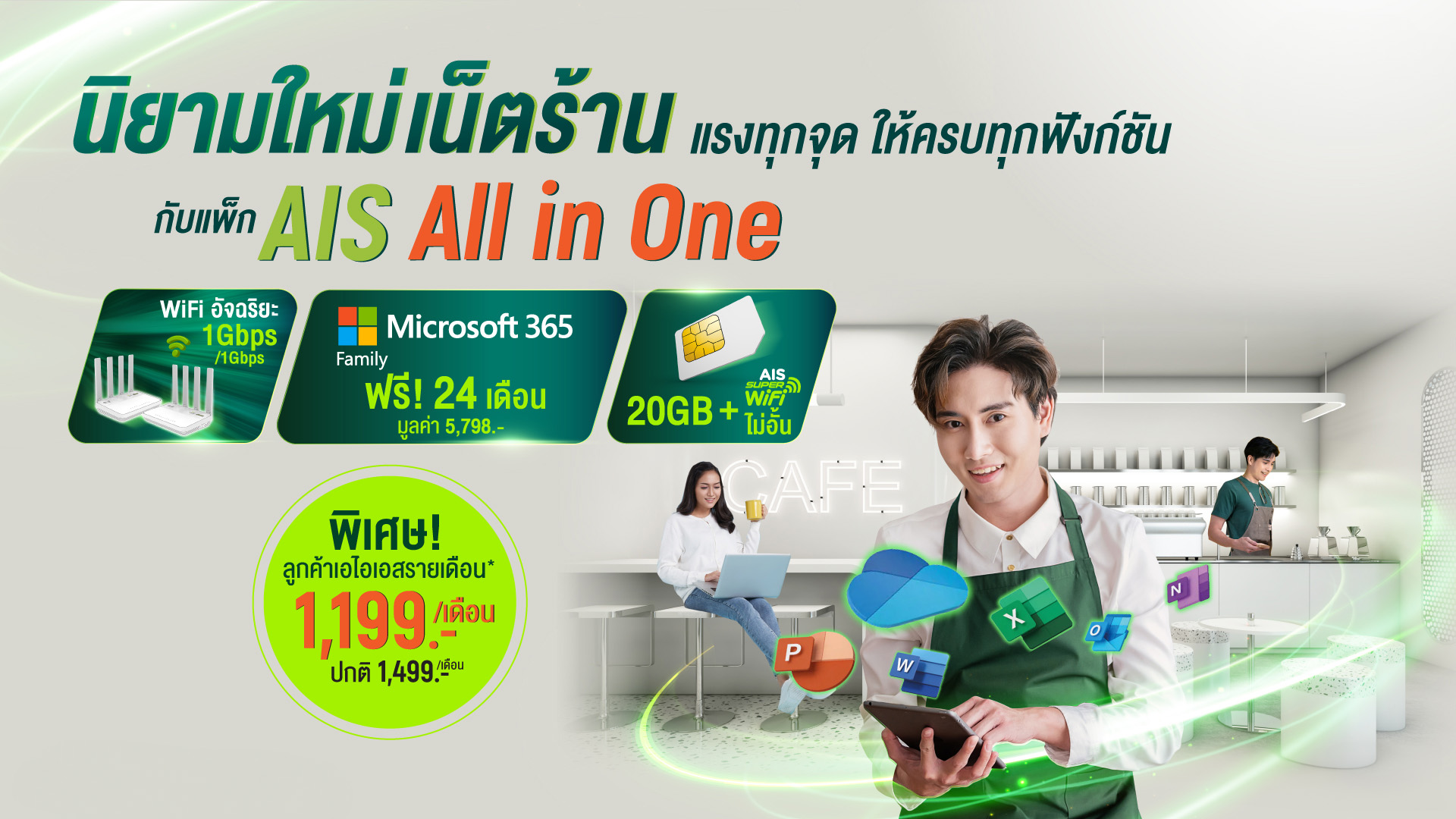 1.แพ็กเกจ AIS All in One : นิยามใหม่ของเน็ตร้าน แรงทุกจุด ให้ครบทุกฟังก์ชัน นอกจากสปีดที่มากพอกับการใช้งานแล้ว ยังมี AI Router ถึง 2 ตัว พร้อม SIM Net 20 GB และพิเศษสุดกับ Microsoft 365 Family ที่ใช้งานได้สูงสุด 6 ผู้ใช้งาน พร้อม One Drive 1TB ต่อผู้ใช้งาน พิเศษสำหรับลูกค้าเอไอเอสรายเดือน ที่มียอดค่าใช้บริการ 349 บาทขึ้นไป สามารถซื้อแพ็กในราคาเพียง 1,199 บาท/เดือน (ลูกค้าทั่วไป 1,499 บาท/เดือน) จะได้รับ On-Top Internet 20GB ที่หมายเลขเอไอเอสรายเดือนที่ใช้รับสิทธิ์เท่านั้น เรียกได้ว่าครอบคลุมทุกมิติการค้าขายอย่างแน่นอน