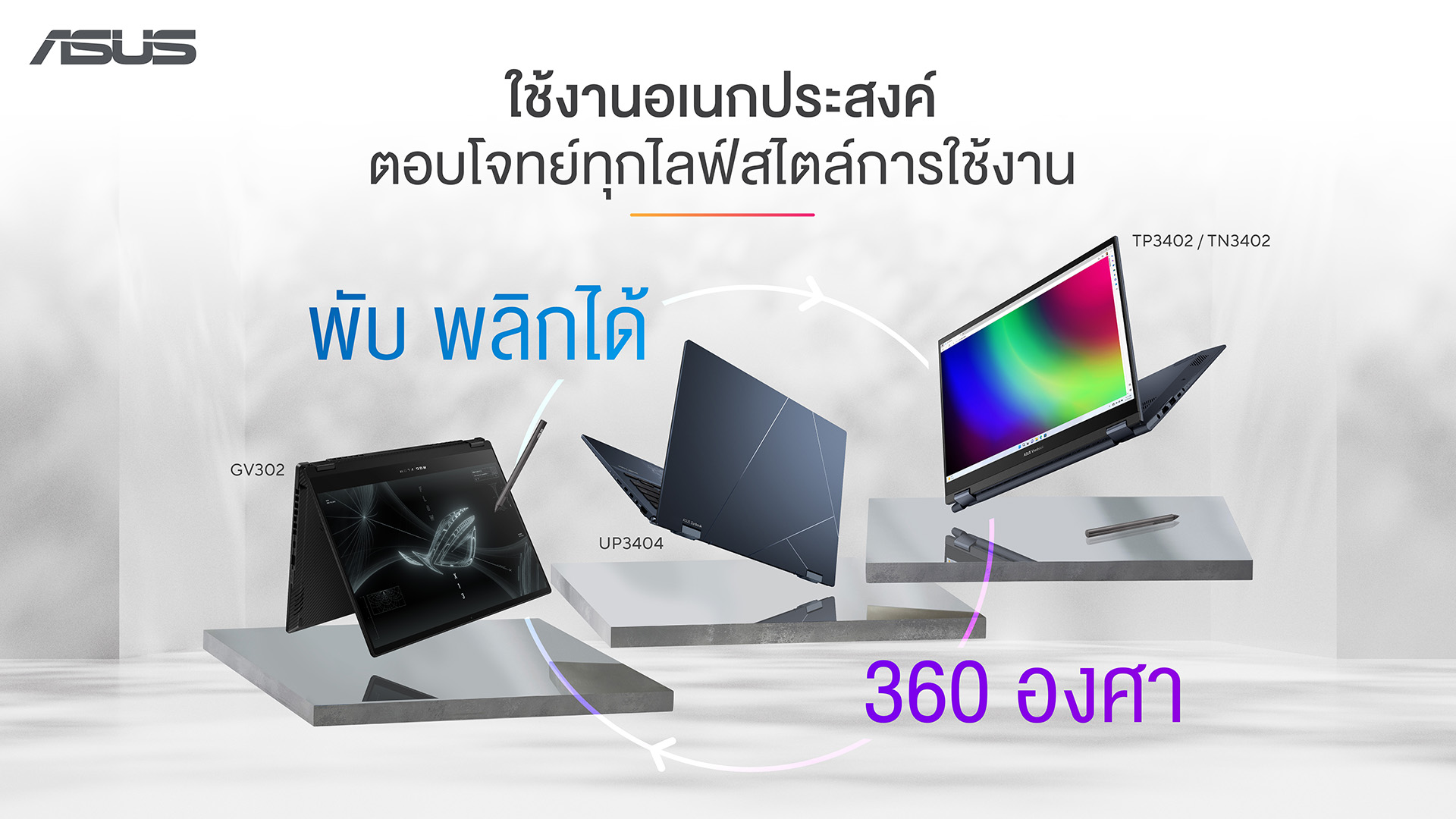 ASUS ขอแนะนำ 4 รุ่นโน้ตบุ๊ก จอสัมผัส พับได้ 360 องศา โน้ตบุ๊กอเนกประสงค์สำหรับใครที่มองหาอุปกรณ์การทำงานที่ใช้งานได้หลากหลายสไตล์ ไม่ว่าจะเป็นแบบโน้ตบุ๊กดั้งเดิม, แบบวางโต๊ะ (Tent Mode) สำหรับดูภาพยนตร์และซีรีส์เรื่องโปรด หรือแบบแท็บเล็ตที่เพิ่มความสะดวกและคล่องตัว ซึ่งเป็นที่นิยมมากขึ้นในกลุ่มคนที่เน้นการพกพา หรือใช้จดงาน วาดเขียนเป็นประจำ โน้ตบุ๊กจอพับได้เอซุส 4 รุ่นยอดนิยมประจำปี 2023 ได้แก่