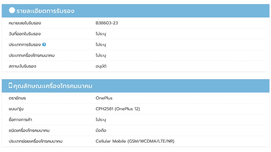 OnePlus 12 ที่ผ่านการรับรองจาก กสทช. มาในรหัสรุ่น CPH2581 ขณะที่เวอร์ชันจีนใช้รหัสรุ่น PJD110 น่าเสียดายที่ข้อมูลจากหน่วยงาน กสทช. ไม่ได้ให้รายละเอียดใดๆ นอกไปจากสนับสนุนเครือข่าย 5G, 4G LTE, 3G WCDMA และ 2G GSM