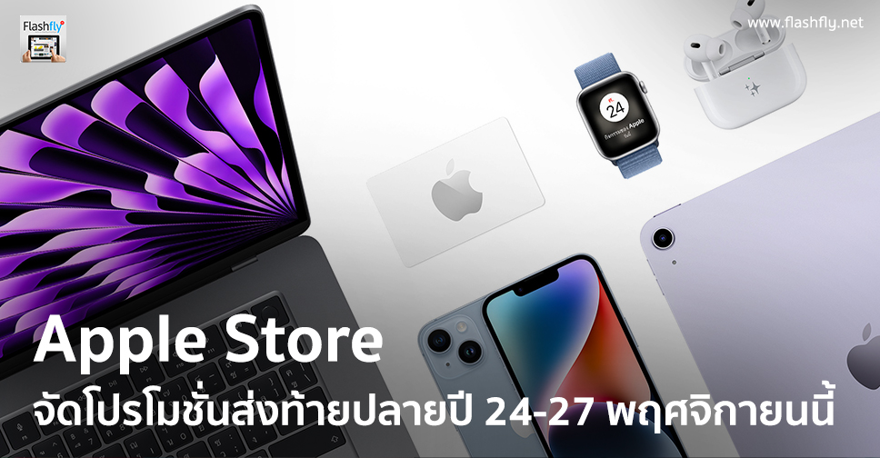 เพื่อเตรียมต้อนรับเทศกาลส่งความสุขในช่วงสิ้นปี Apple Store จัดโปรโมชั่นมอบบัตรของขวัญ Apple Store มูลค่าสูงสุด 7,200 บาท สำหรับใช้ในการซื้อครั้งต่อไป เมื่อซื้อผลิตภัณฑ์ที่เข้าเกณฑ์ ณ ร้าน Apple Iconsiam, Apple Central World หรือสั่งซื้อผ่าน Apple Online Store และ แอป Apple Store ในระหว่างวันที่ 24 – 27 พฤศจิกายน 2023