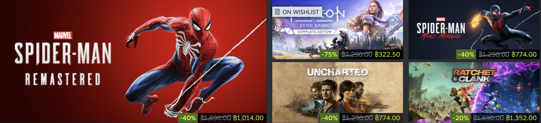 พบกับเกม Ratchet & Clank: Rift Apart เวอร์ชั่น PC ในราคาพิเศษเป็นครั้งแรกบน Steam นอกจากนี้ยังมีเกม Horizon Zero Dawn, Marvel’s Spider-Man Remastered และ Marvel’s Spider-Man: Miles Morales ที่ลดราคามากกว่าครั้งไหน ๆ รายละเอียดเพิ่มเติมแคมเปญ PlayStation Steam Autumn Sale สามารถคลิกดูได้ที่ https://store.steampowered.com/publisher/playstationstudios/ หรือตามตารางด้านล่างนี้