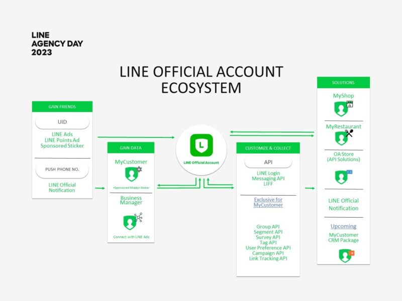 ในด้านการใช้งาน LINE Official Account (LINE OA) ผู้บริโภคนิยมติดต่อสื่อสารกับแบรนด์ผ่าน LINE OA มากขึ้นเรื่อยๆ ไม่ว่าแบรนด์เล็กแบรนด์ใหญ่ต่างเปิด LINE OA เป็นของตนเอง ในปี 2023 มีการใช้เปิดใช้งาน LINE OA เติบโตขึ้น 5% จากปีที่ผ่านมา โดย LINE มุ่งพัฒนาการทำงานของ LINE OA ให้มีประสิทธิภาพสูง ด้วยการทำงานที่ครบวงจร ผ่านการเชื่อมต่อกับเครื่องมือ โซลูชั่นอื่นๆ จาก LINE เช่น LINE Ads ในการเพิ่มเพื่อน MyCustomer และ Business Manager ในการจัดเก็บและบริหารจัดการข้อมูลลูกค้า และ MyShop ในการจัดการระบบหน้าร้านออนไลน์ ไปจนถึงการเปิดการเชื่อมต่อ LINE API ให้นักพัฒนาภายนอกสามารถพัฒนา นำเสนอโซลูชั่นพร้อมใช้ เพื่อช่วยให้แบรนด์ทำธุรกิจได้ง่ายขึ้นบน LINE OA ได้ด้วยเช่นกัน