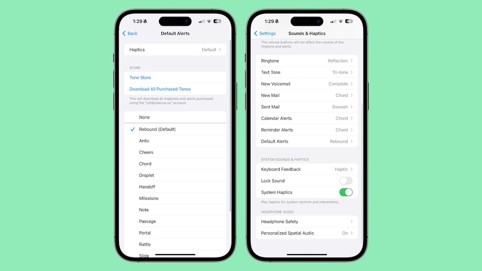 ภายใต้การตั้งค่า Sounds & Haptics จะพบกับเมนูใหม่ Default Alerts ซึ่งช่วยให้ผู้ใช้งาน สามารถเลือกเสียงที่ใช้สำหรับการแจ้งเตือนทั้งหมด นอกเหนือจากข้อความ การแจ้งเตือนทางอีเมล และการแจ้งเตือนปฏิทิน ซึ่งมีตัวเลือกการปรับแต่งอยู่แล้ว โดยเสียงข้อความทั้งหมด สามารถใช้เป็นเสียงแจ้งเตือนเริ่มต้นได้ และยังมีตัวเลือกสำหรับเปลี่ยนการแจ้งเตือนเริ่มต้นเป็นระบบสั่นอีกด้วย