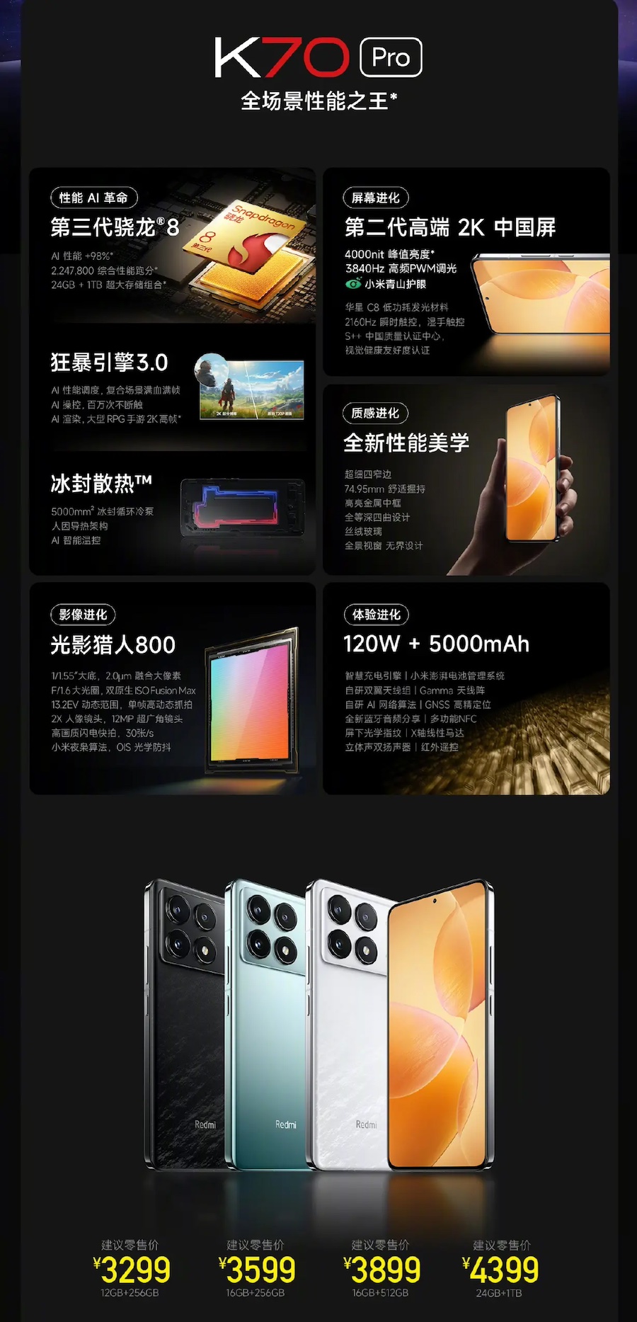 Redmi K70 Pro มีให้เลือก 4 รุ่น ได้แก่ 12GB+256GB, 16GB+256GB, 16GB+512GB และ 24GB+1TB ราคาเริ่มต้น 3,299 หยวน หรือราว 16,590 บาท