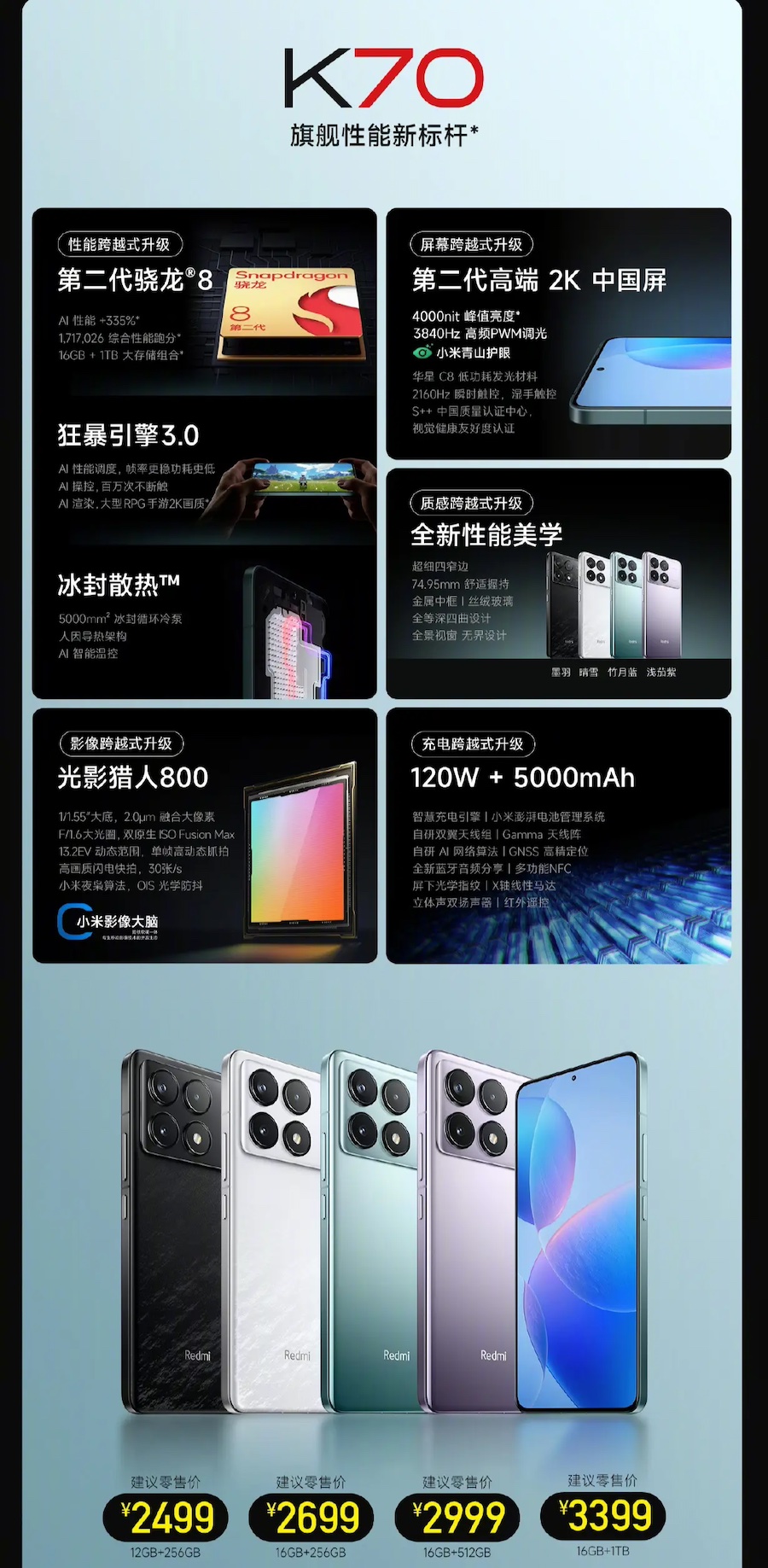Redmi K70 มีให้เลือก 4 รุ่น ได้แก่ 12GB+256GB, 16GB+256GB, 16GB+512GB และ 16GB+1TB ราคาเริ่มต้น 2,499 หยวน หรือราว 12,390 บาท