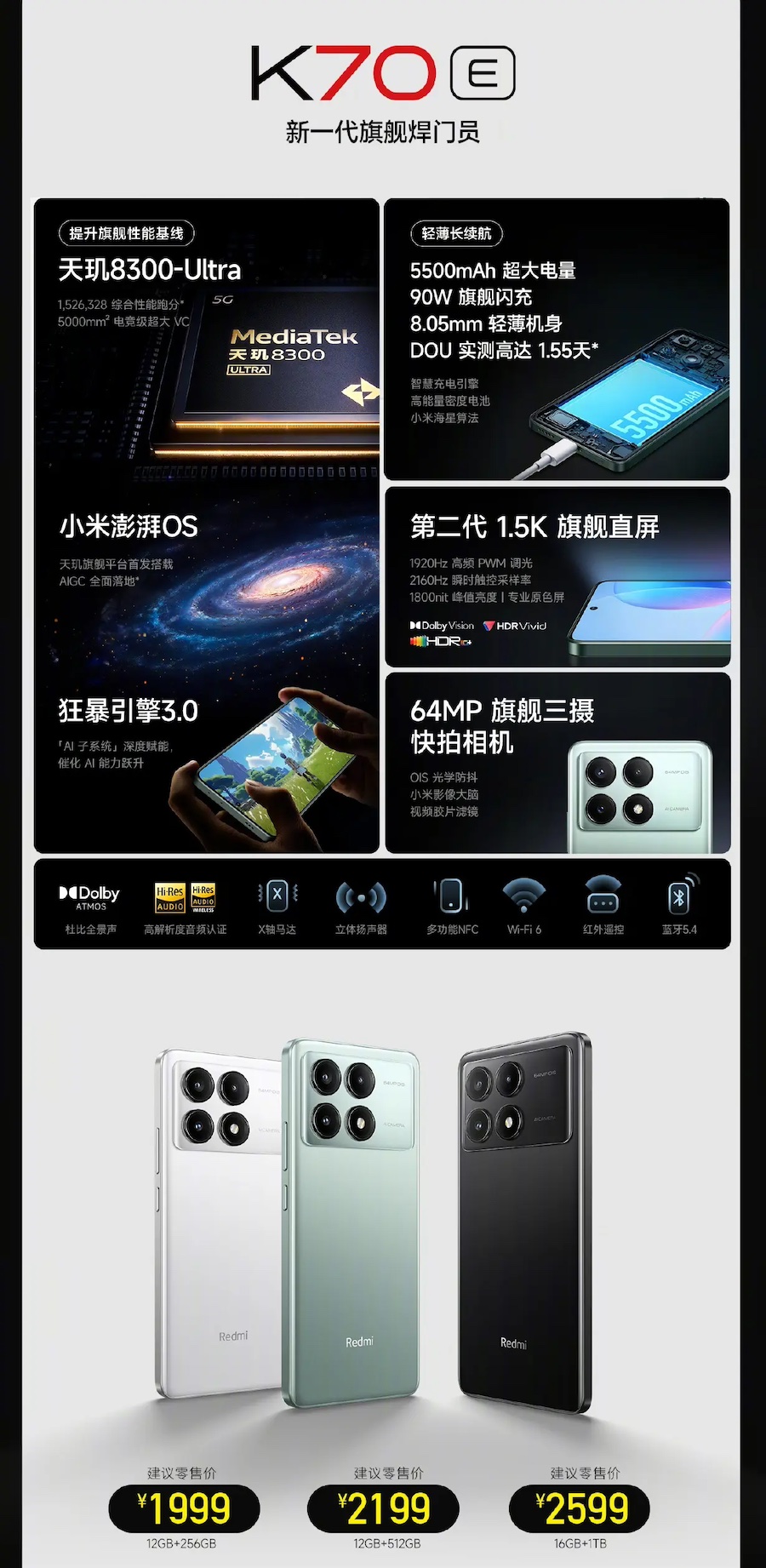 Redmi K70E มีให้เลือก 3 รุ่น ได้แก่ 12GB+256GB, 12GB+512GB และ 16GB+1TB ราคาเริ่มต้น 1,999 หยวน หรือราว 9,890 บาท