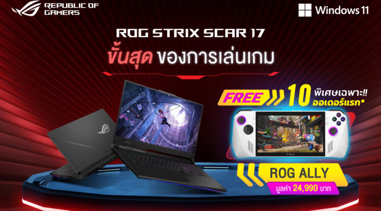 ขั้นสุดของการเล่นเกมกับ ROG Strix Scar Series โดดเด่นด้วยประสิทธิภาพระดับสูงสุด ทั้งจาก Intel Core i9-13980HX, AMD Ryzen 9 7945HX และ Nvidia GeForce RTX 4090 ระบบระบายความร้อน ROG Intelligent Cooling ที่ยอดเยี่ยมด้วยสารนำความร้อนโลหะเหลว Thermal Grizzly Conductonaut Extreme ทำงานร่วมกับพัดลมระบายความร้อนสูงสุดถึงสามตัว ให้การใช้งานเครื่องมีความเสถียรและเย็นกว่าที่เคย เกมมิ่งฟีเจอร์ครบครัน พร้อมให้ทุกการเล่นเกมทำได้ลื่นไหลพร้อมคว้าชัยชนะในทุกสมรภูมิ ROG Strix Scar มีมาให้เลือกใช้งานในสามขนาดหน้าจอ ไม่ว่าจะเป็น 15.6, 17.3, หรือ 18 นิ้ว พบข้อเสนอส่วนลดสูงสุดถึง 7,000 บาท และรับฟรี SSD SN350 500GB มูลค่า 1,290 บาทเมื่อซื้อ ROG Strix Scar ทุกรุ่น โดยเอซุสขอนำเสนอรุ่นไฮไลท์ ROG Strix Scar 17 (G733PZ-LL023W) ที่แรงสุดขีดด้วยโปรเซสเซอร์ AMD Ryzen 9 7945HX จับคู่กับการ์ดจอระดับไฮเอนด์ Nvidia GeForce RTX4080 แรมขนาดใหญ่ถึง 32GB หน้าจอที่สมบูรณ์แบบสำหรับการเล่นเกมด้วยขนาด 17.3 นิ้ว ความละเอียด 2K รีเฟรชเรทสูงถึง 240Hz พิเศษสำหรับ 10 ท่านแรกที่ซื้อเครื่องรุ่นนี้ในงานคอมมาร์ต รับ SSD SN350 500GB มูลค่า 1,290 บาท และ ROG Ally มูลค่า 24,990 บาท รวมมูลค่า 26,280 บาท