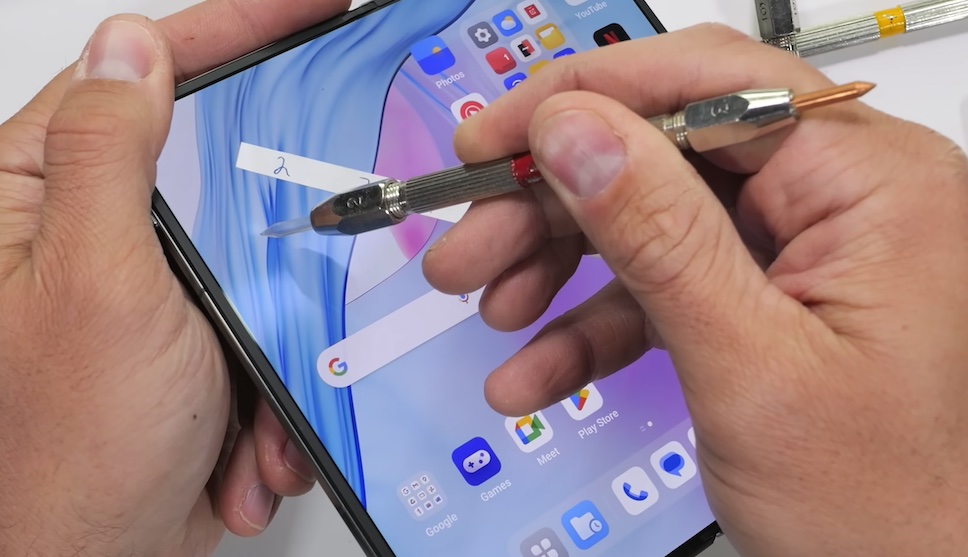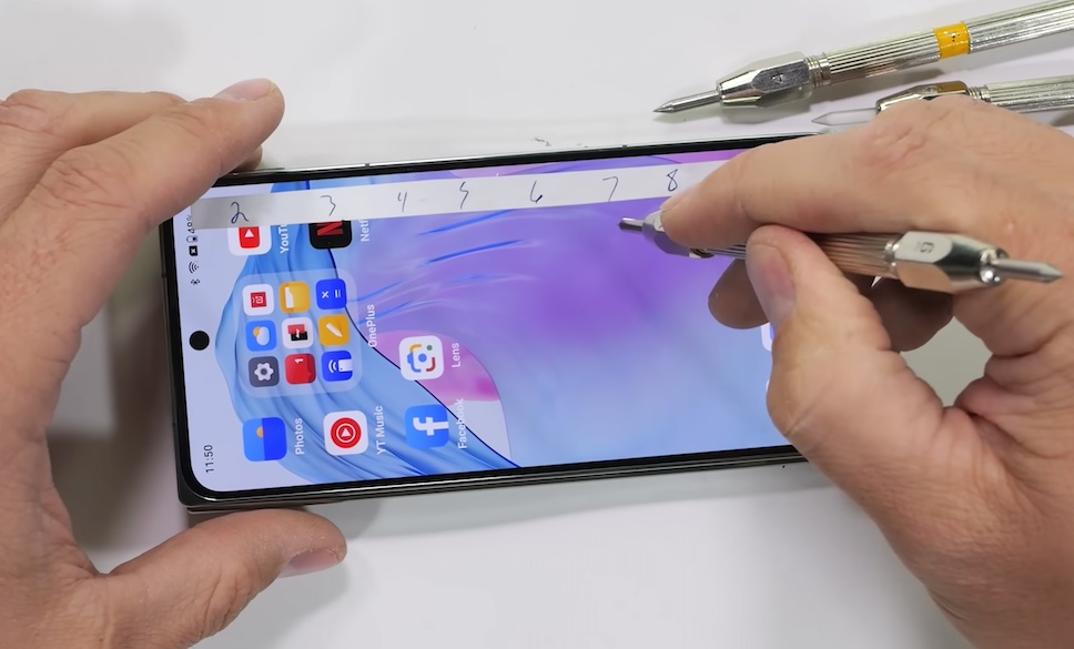 JerryRigEverything ยังใช้ใบมีดที่มีความแข็งแรงกรีดไปทั่วร่างของ OnePlus Open ซึ่งกรอบด้านข้างทำจากอะลูมิเนียม แต่ไฮไลท์ที่สำคัญอยู่ในช่วงท้ายของการทดสอบ นั่นคือการดัดตัวเครื่องให้โค้งงอด้วยมืิอเปล่า ซึ่ง Zack Nelson เคยทำ OnePlus 10T หักคามือมาแล้ว แต่ไม่เกิดขึ้นกับ OnePlus Open เรียกได้ว่าสมาร์ทโฟนจอพับได้รุ่นแรกของ OnePlus มีความทนทานสูงจน Zack Nelson ต้องยกนิ้วให้