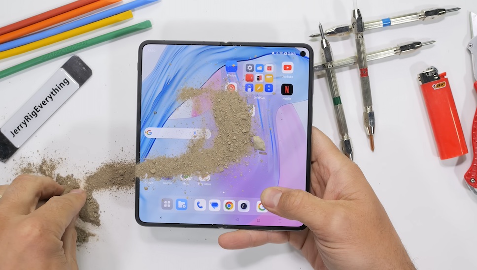 OnePlus Open ยังถูกทดสอบความทนทานของจอแสดงผลและบานพับด้วยการโรยทรายละเอียด แล้วลองพับอยู่หลายครั้ง ก่อนจะใช้ไฟแช็คเผาจอแสดงผลทั้งด้านนอกและด้านใน ซึ่งทิ้งรอยด่างจากการถูกเผาไหม้ไว้ให้ดูต่างหน้า แต่จอด้านนอกทนความร้อนได้ดีกว่าจอด้านใน