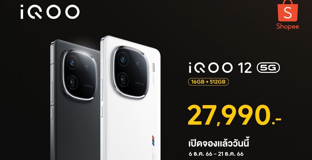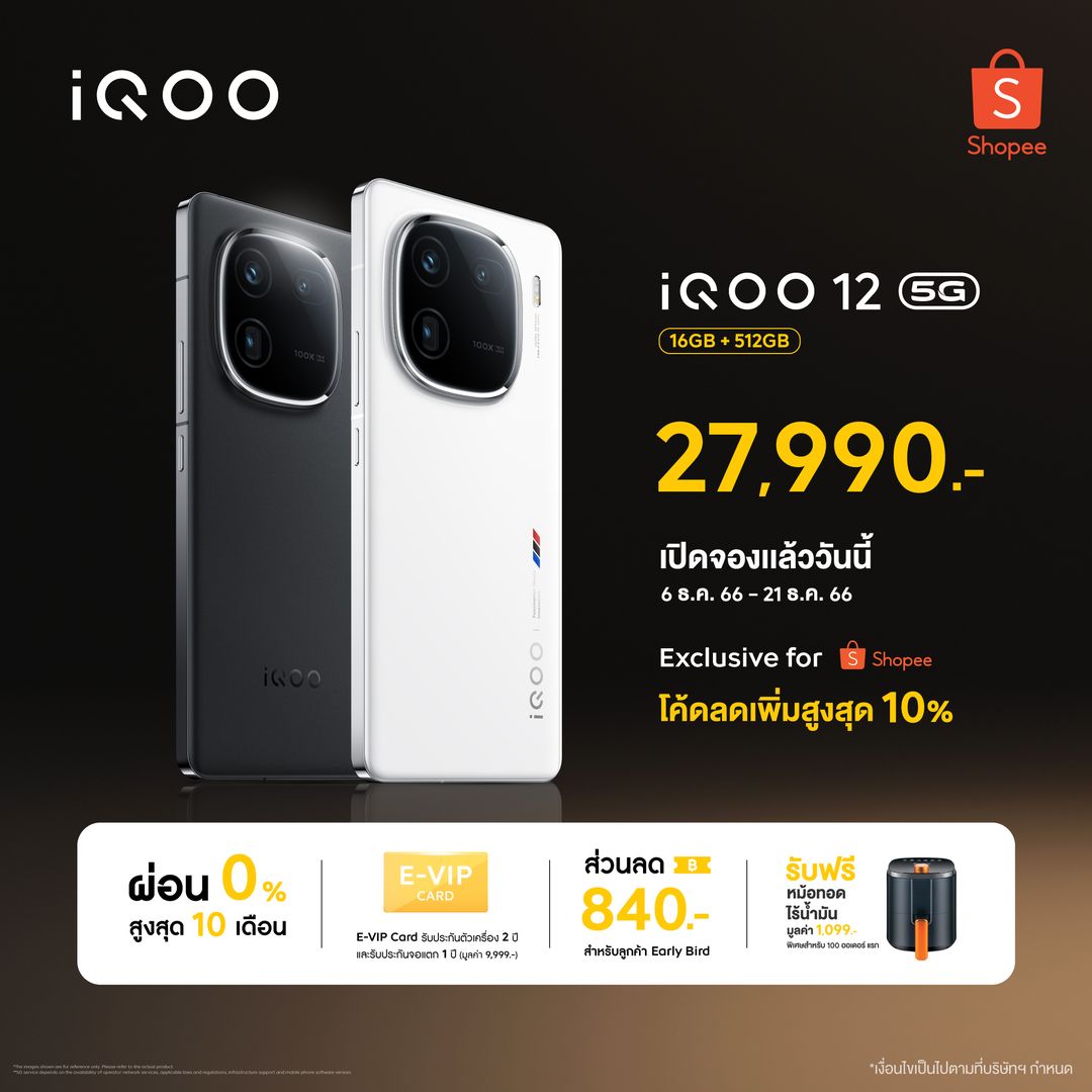 iQOO 12 5G สีขาว (Legend Edition) และ สีดำ (Alpha Edition) เตรียมวางจำหน่ายอย่างเป็นทางการในราคา 27,990 บาท โดยเปิดให้ผู้ที่สนใจสามารถจับจองเป็นเจ้าของได้ก่อนใครในรอบ Early Bird ตั้งแต่วันที่ 6 – 21 ธันวาคม 2566 ผ่านช่องทาง Shopee พร้อมรับส่วนลดเพิ่มเติมถึง 840 บาท ผ่อน 0% สูงสุด 10 เดือน พิเศษเฉพาะ E-VIP (มูลค่า 9,999.-) รับประกันตัวเครื่องเพิ่มเป็น 2 ปี และประกันหน้าจอแตก 1 ปี 1 ครั้ง
